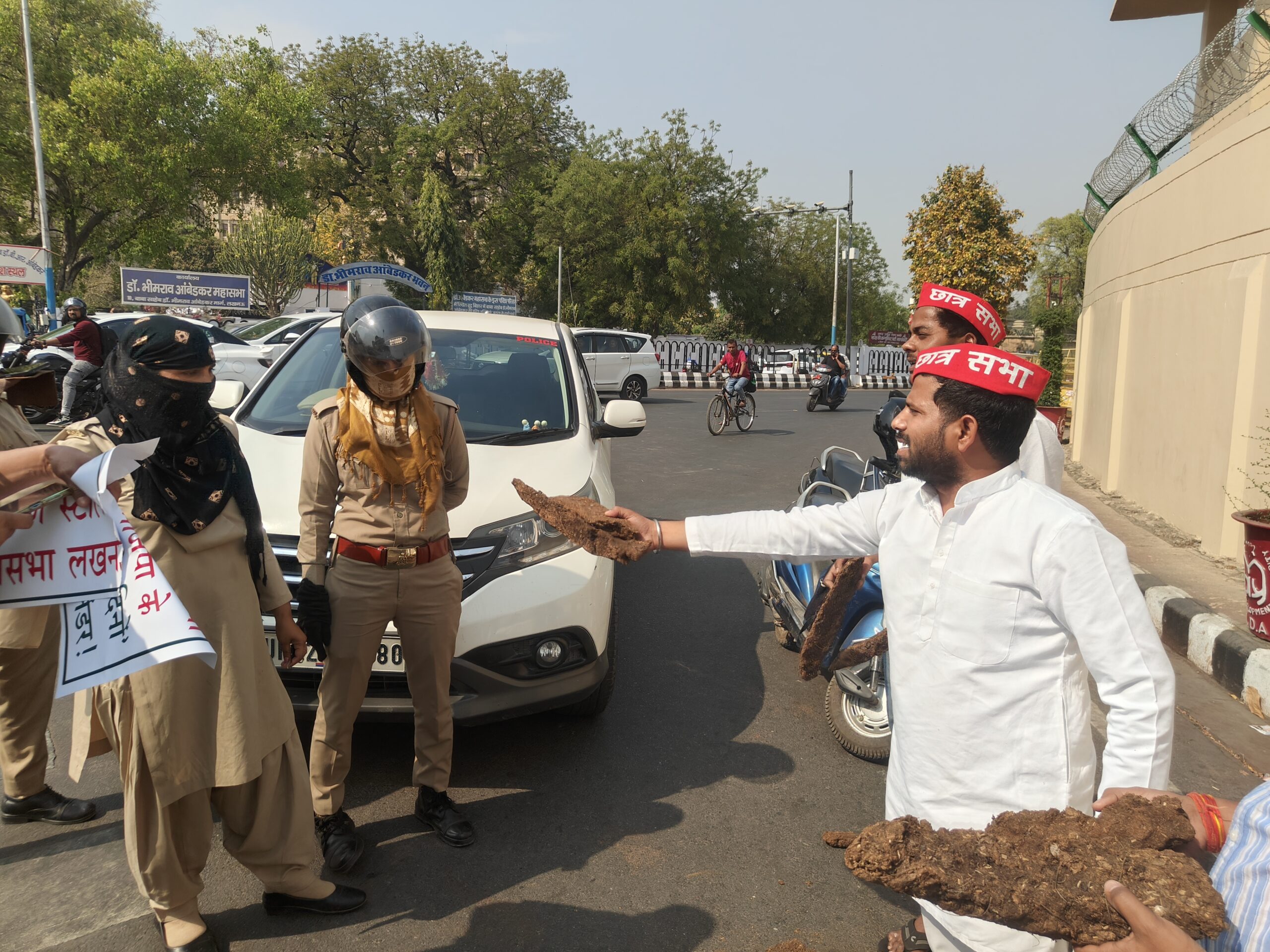 विधान भवन के समीप इस तरह के प्रदर्शन की सूचना पाकर मौके पर पहुंची पुलिस ने समाजवादी छात्र सभा के कार्यकर्ताओं को रोकने की कोशिश की इस दौरान कार्यकर्ताओं और पुलिस के बीच नोकझोंक हुई जिसके बाद पुलिस ने तीन कार्यकर्ताओं को हिरासत में लेकर मौके पर रखे उपलों को भी जब्त कर लिया।