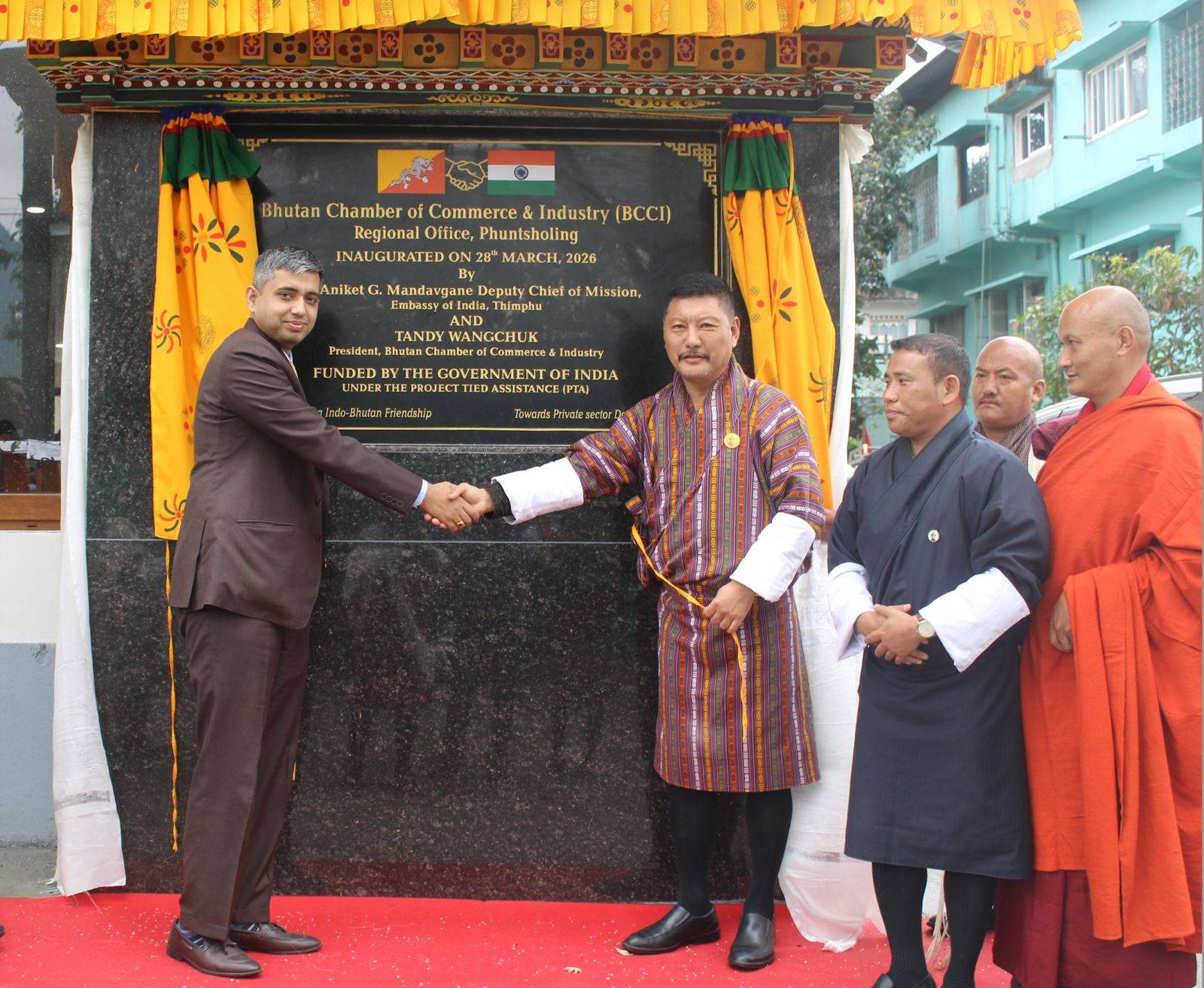 फुंटशोलिंग, भूटान में भारतीय दूतावास ने हाल ही में फुंटशोलिंग में भूटान चैंबर्स ऑफ़ कॉमर्स एंड इंडस्ट्री (बीसीसीआई) के क्षेत्रीय कार्यालय के उद्घाटन की घोषणा की। इस समारोह में मिशन के उप प्रमुख अनिकेत जी. मांडवगने और बीसीसीआई के अध्यक्ष टैंडी वांगचुक शामिल हुए।